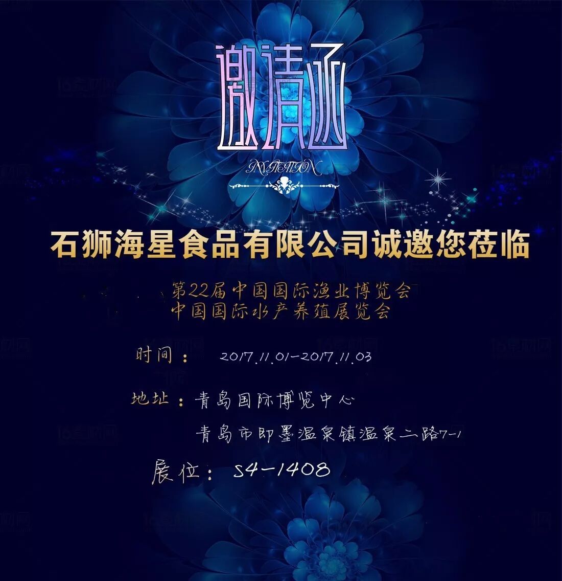 感謝您一直以來對石獅海星食品有限公司的關心和支持使公司得以業務蓬勃發展,公司于11月1日——3日公司參展于第22屆中國國際漁業博覽會和中國國際水產養殖展覽會,誠邀您參觀!展位號碼:S4-1408,展館地址:青島國際博覽中心(青島市即墨溫泉鎮溫泉二路7-1)