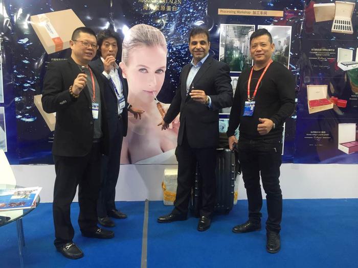 海星自主研發的魚膠原蛋白肽產品吸引了外國客商前來咨詢品嘗。